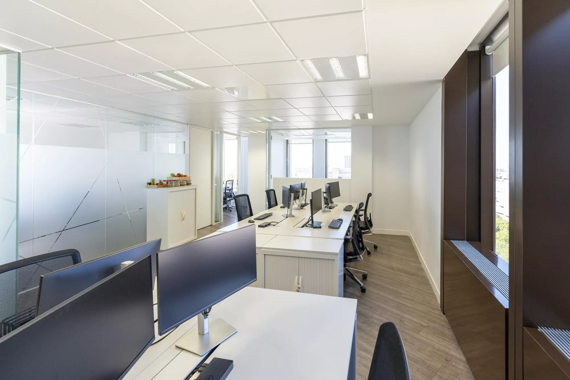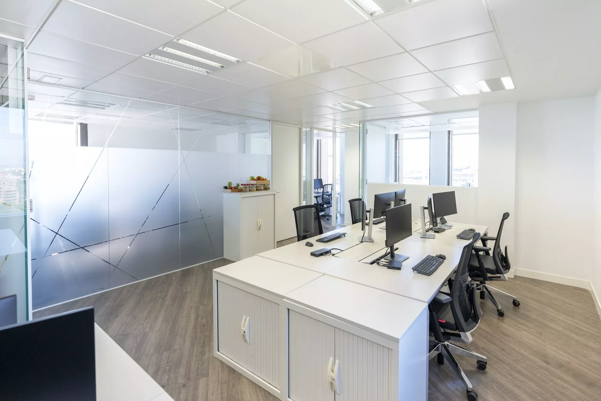 La empresa ahora cuenta con una oficina de 85 m², completamente adaptada a sus necesidades, y una sala de reuniones equipada con un sistema de videoconferencia integrado. Nuestro equipo de IT dio solución a sus peticiones concretas y coordinamos el acceso al parking compartido y el suministro semanal de frutas y frutos secos.