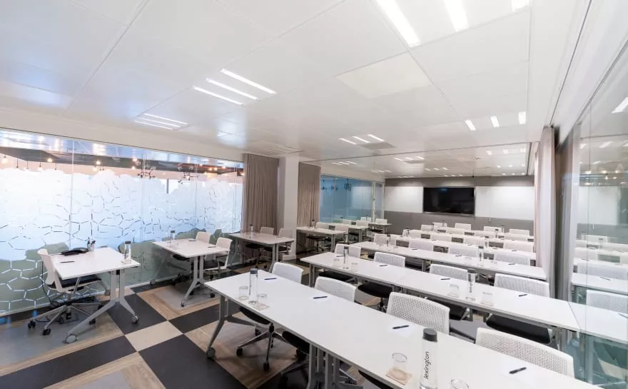 Tables and chairs facing forward, perfect for training sessions.